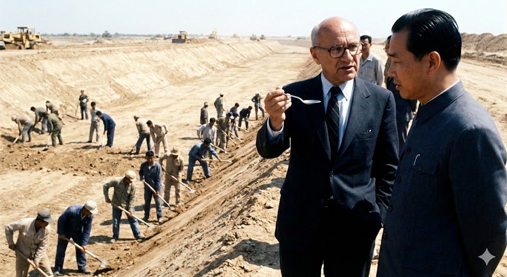 Friedman responded, “Oh, I thought you were trying to build a canal. If it’s jobs you want, remove the shovels and give these workers spoons!”
