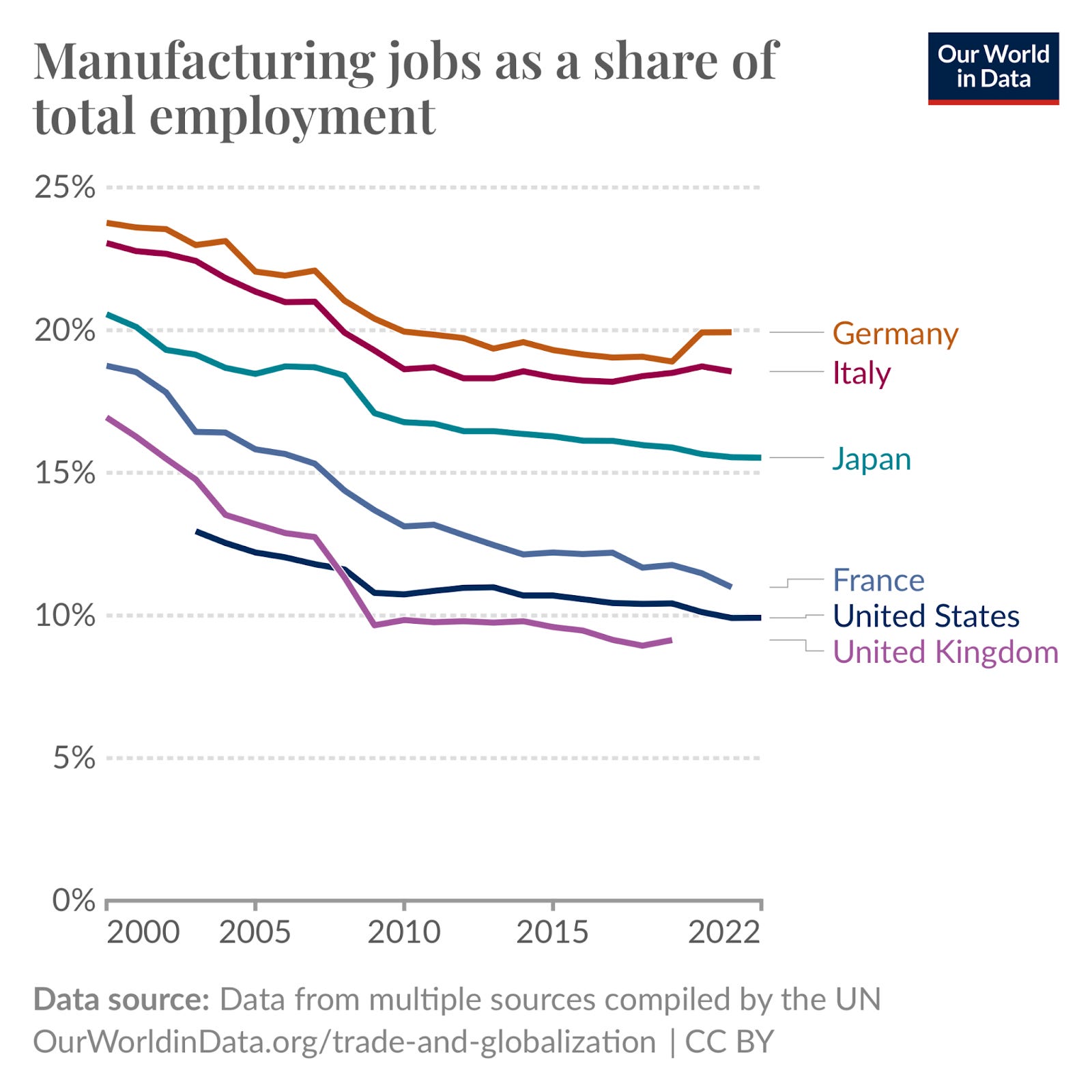 A lot of the emotional energy behind industrial policy comes from nostalgia for mid-20th-century manufacturing. In 1950, manufacturing accounted for roughly a third of U.S. nonfarm employment. Today it’s about 8–9%. For many communities and blue-collar men, this decline represents a loss of status, identity, and middle-class security.