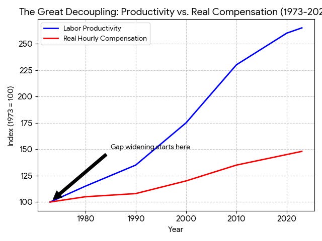 The tension between jobs and wages reflects two differing visions of economic justice. One concerns the importance of work as a form of belonging. It emphasizes the preservation of stable employment in industries that anchor communities. Oren Cass and his team at American Compass articulate this vision very effectively. The other concerns work and productivity: dynamic sectors that push the technological frontier and generate rising incomes.