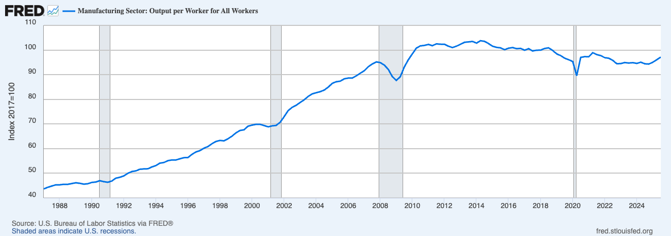 This is success, not failure. In many sectors, the U.S. didn’t “stop making things.” It learned to make things with far fewer workers. A graph of manufacturing output per worker clearly shows this (if anything, it indicates a troubling lack of productivity gains in manufacturing after 2012).