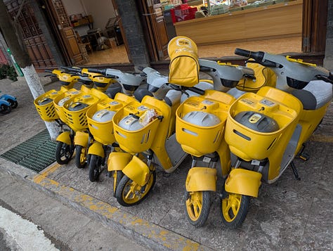 Every road has hundreds of these scooters, which are both incredibly useful and super annoying. They increase the carrying capacity of roads and solve the last-mile transportation problem, but they are a silent menace to anyone on foot or on a bike. These scooters are the backbone of China’s massive gig-based instant delivery services, a topic I plan to write about in more detail soon.