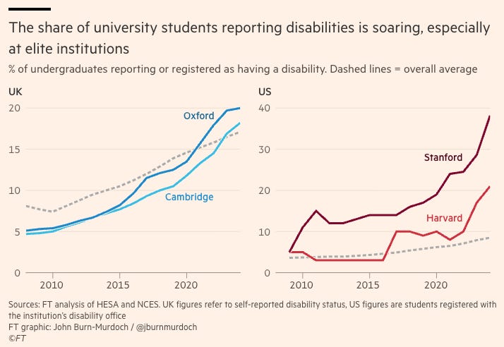 How do students who are manifestly unprepared for college cope with being tossed into a demanding academic environment? Many declare themselves disabled. Writing for this week’s Atlantic magazine, Rose Horowitch reports that in 2009, five percent of undergraduates at Harvard and Stanford declared themselves disabled. Today, 21 percent of Harvard students and 38 percent of Stanford students request special academic accommodations, especially extra time on tests and papers, by claiming a disability that was rarely evident in high school. In the FT, John Murdoch-Burns finds this trend widespread across many OECD countries.3
