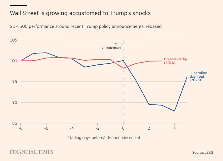 Investors expect Trump-induced volatility to be temporary. Every major Trump-era scare—tariffs, shutdown threats, NATO posturing—has followed the same arc: a short-lived volatility pop followed by rapid mean reversion. Traders expect the confrontation to be walked back, delayed, or diluted. They bet on TACO.