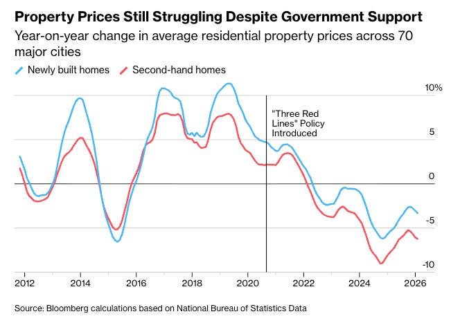 The details are complex, but the local financial burden remains acute. The central government’s ongoing CNY 10 trillion debt-substitution program—which refinances hidden LGFV debt into explicit local government bonds—is designed to address the large debt-servicing gap. However, Fitch notes that it currently covers only about 30% of that gap.