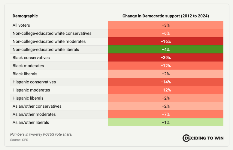 These voters prioritize cost of living, healthcare, jobs, border security, and public safety over the cultural and political interests of highly educated and affluent voters who dominate the party’s internal conversation. Many voters have concluded Democrats care about something other than their central concerns.