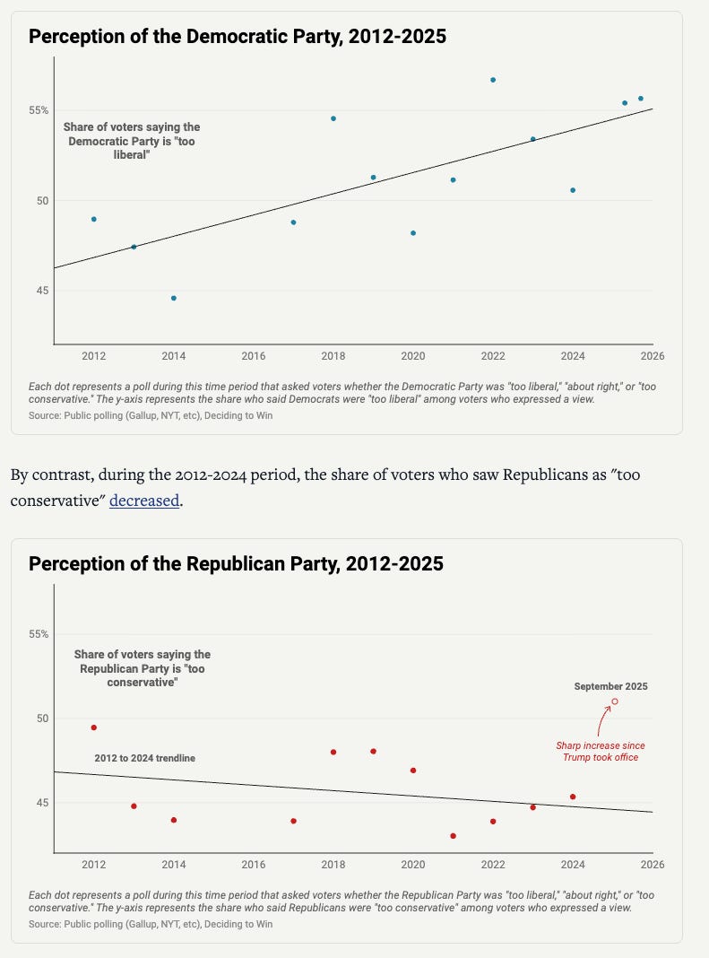 Democrats began talking less about the cost of living, jobs, crime, and immigration, and more about climate, identity, and culture. Deciding to Win describes a severe “Democratic penalty” — a structural disadvantage attached to the party’s name. By 2025, 54% of voters thought Democrats were too liberal — a larger share than thought Republicans were too conservative.