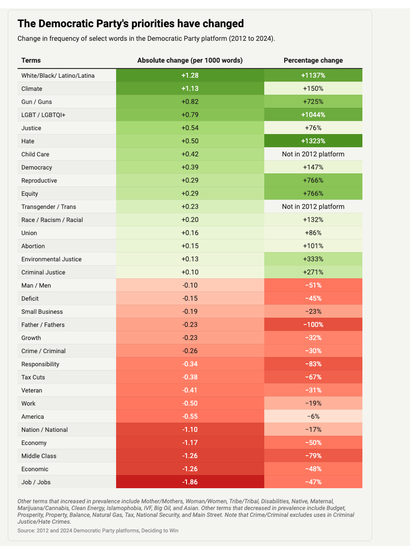 Even crude measures show the drift. A word-frequency analysis of the party’s 2012 and 2024 platforms — the latter opening with a four-paragraph land acknowledgment for Chicago — illustrates how cultural messaging has crowded out economic language.2