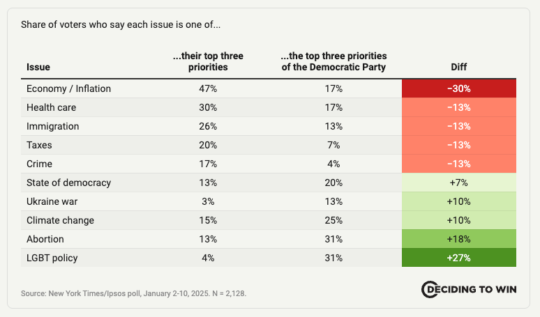 One post-election poll found that while 47% of voters listed the economy among their top three concerns, only 17% thought the economy was among the issues Democrats cared about most. That gap is stark — and lethal.